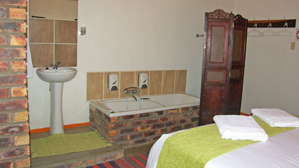 Sleep max 2 people. Room with a double bed. Open plan bath with movable screen, basin and toilet behind wall. Table and chairs. Aircooler, Fan, small fridge & microwave. Coffee making facility. Heater.
