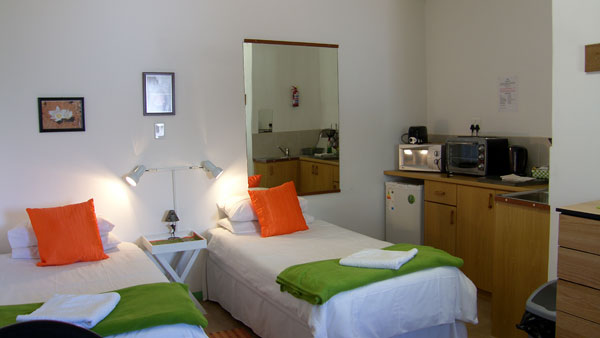 Unit sleeps 4 people (can add sleeper couch). Main bedroom with double bed, built in cupboard, couch, shower toilet and basin. 2nd room has two single beds, a table and chairs and a self contained kitchenette. Aircoolers & Fans. Heaters in both rooms. TV with DStv (hotel package). Fully enclosed yard with own built in braai.